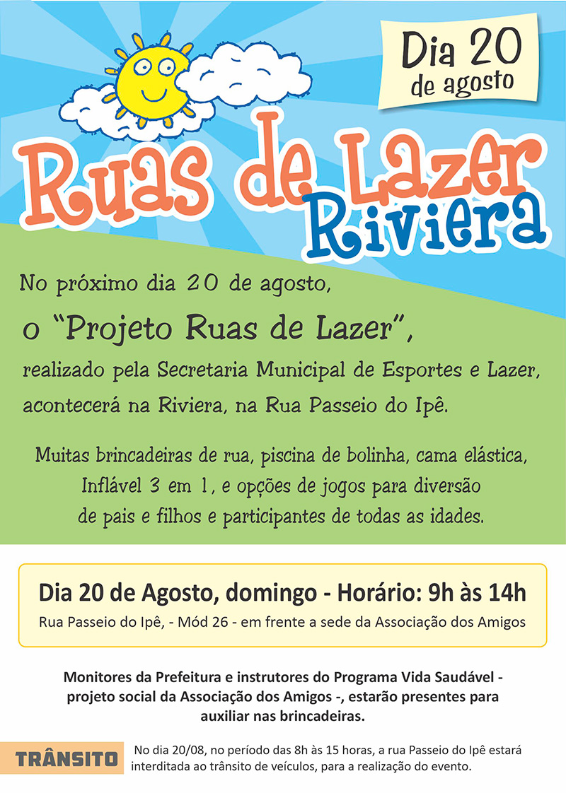Nesse domingo (20 de agosto), o Projeto Ruas de Lazer, realizado pela Secretaria Municipal de Esportes e Lazer, acontecerá na Riviera, na Rua Passeio do Ipê, próximo à sede da Associação dos Amigos da Riviera e do Colégio Metodista.